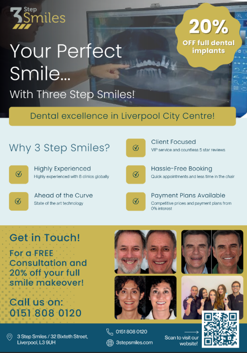 Liverpool’s leading private dental practise, 3 Step Smiles, have an incredible offer of 20% off dental implants — running until the end of May 2025. Located on Bixteth Street in Liverpool’s business district, the clinic offers the highest quality dental work using state of the art technology.
