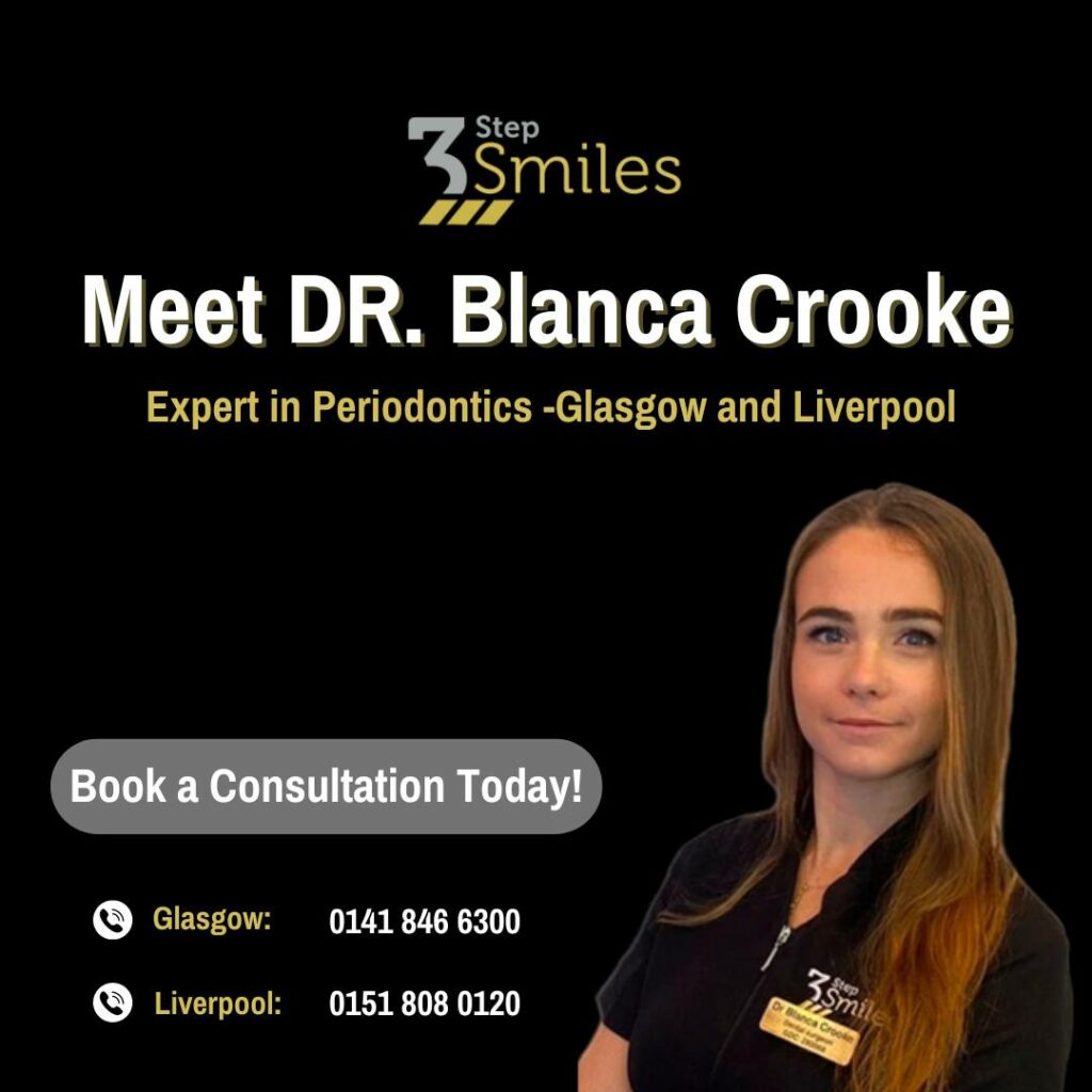 Dr Blanca Crooke, Director at 3 Step Smiles in Liverpool and Glasgow, is a respected figure in dentistry. Specializing in dental implants, periodontal surgery, and more, she’s dedicated to top-tier patient care. Her expertise: