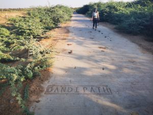 On 12th March 2020, 90 years later to the day, along with over 100 other people, Clare Brumby began following in Gandhi’s footsteps as part of her Arts Council England funded project. Following a commemorative ceremony at Gandhi’s Ashram in Ahmedabad, Clare embarked upon the pilgrimage with a core group of around 20 people from India, the U.S and Netherlands. Heading the walk was none other than Tushar Gandhi – the great grandson of the iconic figure.