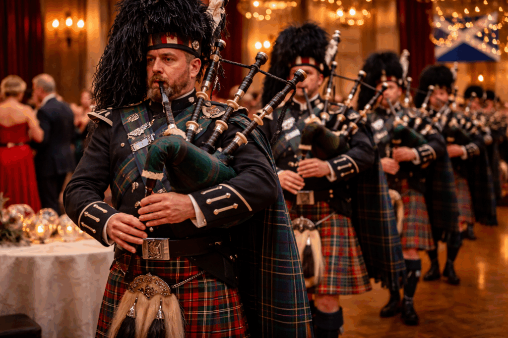 Music and ceremony will play a central role in the evening. The Pipe Major of the Wirral Pipe Band will provide the stirring sound of the bagpipes, while Scottish country dancing will be called by the Royal Scottish Country Dancing Society, inviting guests to enjoy and participate in this lively tradition. A Guard of Honour will add further pageantry to the occasion.