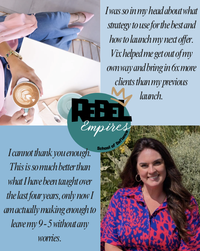 “With a unique fusion of brand positioning, identity mastery, and deep mindset work, I help ambitious entrepreneurs ditch outdated models and build businesses that feel as effortless as they are impactful,” says Vix Marie, founder of Rebel Empires.