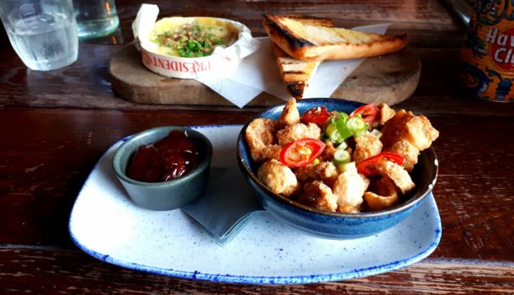 For our starters, my dining partner Paula had Baked Camembert and I had Crunchy Pork Crackling with chilli jam — nice simple dishes and very well presented. For our mains, we both opted for their signature Hanging Kebabs — with Paula choosing the salt and pepper pork belling with bang bang sauce and the chicken and chorizo option for me.