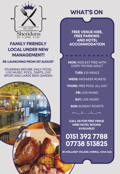 Whether you’re looking for a cosy drink, a hearty meal or a vibrant evening out, Sheridans delivers on all fronts. With one of the most experienced and dynamic landladies now at the helm, exciting times lie ahead for this gem in the heart of Wallasey Village.