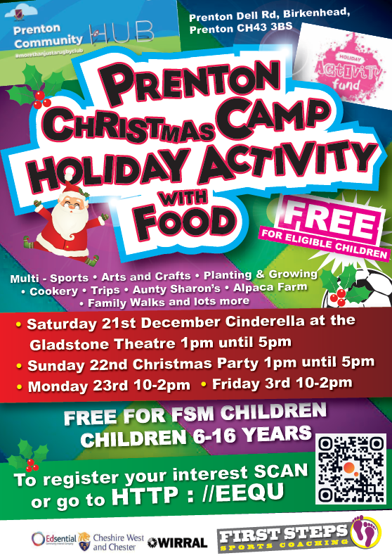 A free Christmas Holiday Camp for children is taking place at Prenton Rugby Club! On Saturday 21st December, Sunday 22nd December, Monday 23rd December and Friday 3rd January, there will be a range of fun and engaging activities — free for children who qualify for benefits related free school meals.
