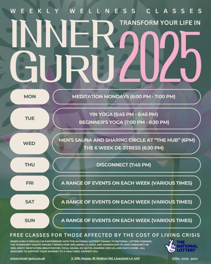 Liverpool wellbeing hub, Inner Guru CIC, is offering free wellbeing treatments in 2025 to help those struggling with the cost of living crisis. Thanks to National Lottery and Sport England funding, free classes, workshops and treatments are available including meditation, breathwork, yoga, sharing circles, sports massage and more.