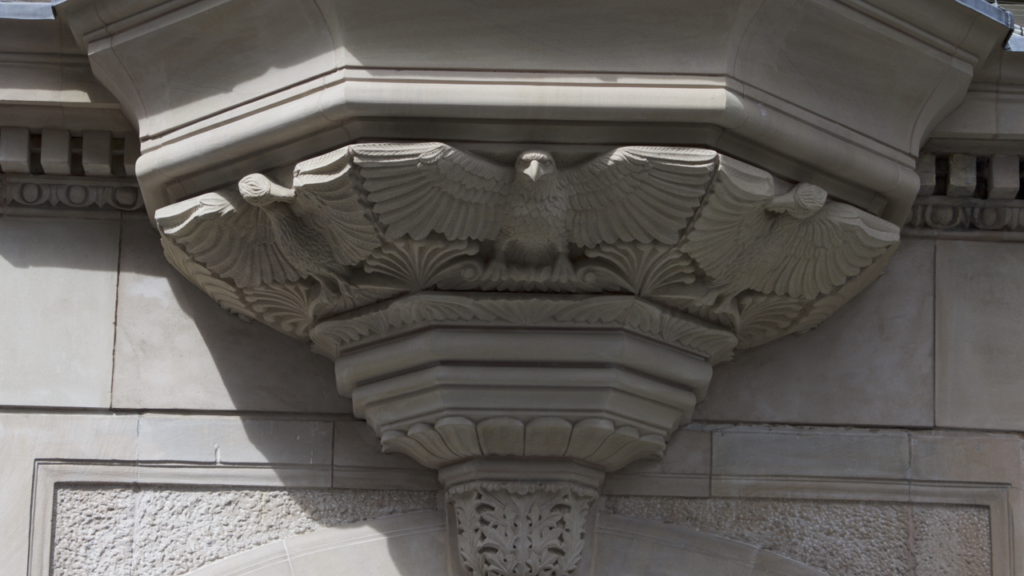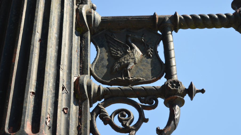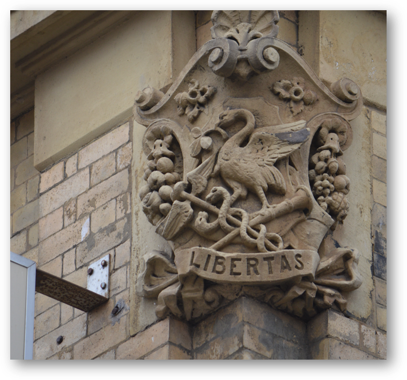 This is because the frieze was carved before the Liver Bird became the official symbol of Liverpool. Yet if you look very closely you will find one very small Liver Bird. If you are looking at the building from the front look to the left (West) face and you will see a door that leads to an arched metal frame in the railings surrounding the building. On the top of the arch is a lamp and on top of that lamp is a very tiny Liver Bird.