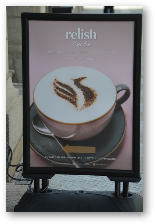 Not all Liver Birds are old. It is, perhaps, not surprising that Liver Birds are used in advertising in and around Liverpool. One obvious place that you would expect to find a Liver Bird doing some advertising is the coffee shop at the Royal Liver Building where they will even put a chocolate Liver Bird on your Cappuccino!