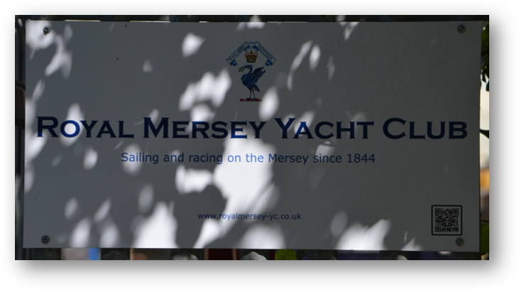 The dappled sunlight on the sign of the Royal Mersey Yacht Club in Rock Ferry.