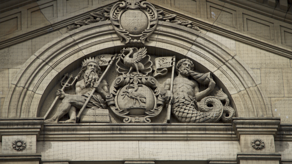 The coat of arms, as well as the Liver Bird, has a depiction of the Mersey and a star but it is supported by Neptune, the God of the Sea and Mercury, God of Trade. This representation of Liverpool being a Maritime and Mercantile city can be found depicted in many places.