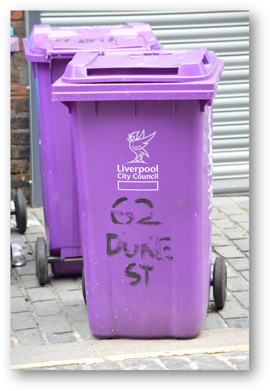 In Liverpool even the most mundane objects proudly wear the Liver Bird including bins and bollards. There are even at least two pieces of graffiti or street art depicting Liver Birds – by the look of it they are from the same stencil – one of them is in Wolstenholme Square and the other on the pillar of a doorway to a boarded up property in Duke Street.