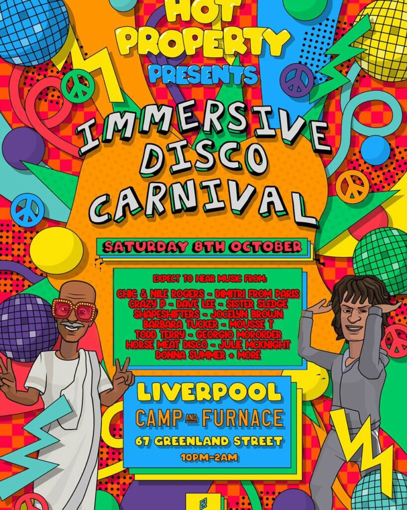 Animation Fella’s Hot Property Events brings Psychedelic Disco Carnival to Camp & Furnace in The Baltic Triangle on Saturday 8th October from 8pm until late. The night will feature Derek Kaye, Jimmy Allen and special guests plus C02, confetti cannons, giant disco balls, podium performers, colour explosions, props and more.