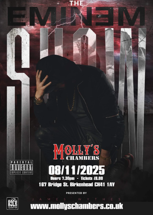 A huge event is coming to Birkenhead this November! On Saturday 8th November, Molly’s Chambers will host The Eminem Show, the UK’s most intense, authentic and electrifying Eminem tribute act — bringing the fire, flow and fury of Marshall Mathers to the heart of the Rock Quarter.