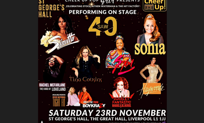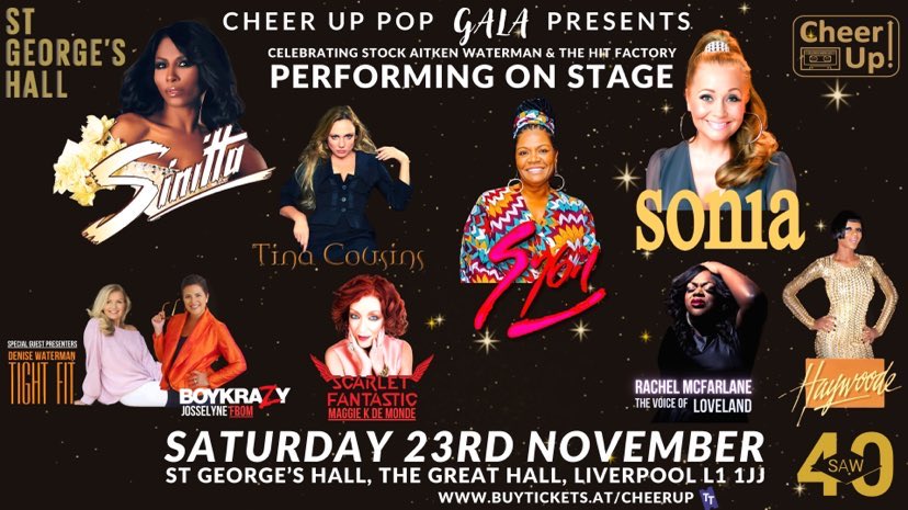 A huge pop gala is coming to Liverpool’s iconic St. George’s Hall on Saturday 23rd November. Feelgood events concept Cheer Up Pop Party are hosting the glamorous showcase, which will feature iconic pop queens Sonia, Sinitta, Sybil, Tina Cousins, Rachel McFarlane, Haywoode and Maggie K De Monde — with guest presenters Josselyn from Boy Krazy and Denise Waterman of Tight Fit.