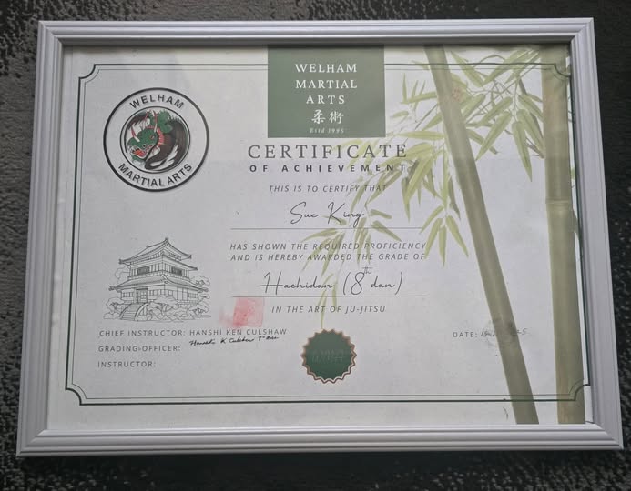 Sue explains: “I want to express my heartfelt thanks to Kenneth Culshaw Hanshi, John Greenhalgh Hanshi and to everyone who made this possible. I have never been one to chase grades or titles; for me, Jujitsu has always been, and remains, a lifelong study. After more than 40 years on the tatami, I’ve learned that rank is not a reward, it is a responsibility.”