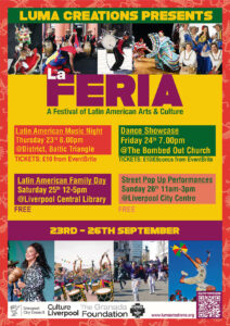 A festival of Latin American Arts and Culture is set to take over city centre venues in Liverpool this month. For their 10th Anniversary activities, local arts organisation LUMA Creations are proud to present LA FERIA, an innovative and colourful celebration of Latin American Arts and Culture.