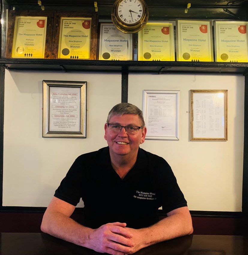 Stephen Brady is celebrating 25 years at New Brighton’s iconic waterfront pub, The Magazine Hotel. The multi-award winning pub on the banks of The Mersey offers quality home cooked food, a fine selection of beers and ales, live music, beer and cider festivals, darts and a gem of a garden to the rear.