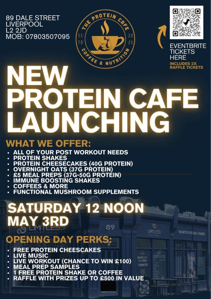 Liverpool’s multi-award winning gym, Limitless Lifestyle Community, are opening their new protein cafe on Dale Street — aiming to bring new, healthy, high protein alternatives that taste great. The cafe is open to the general public, not just gym members, and offers a wide range of healthy, high protein food and drinks — with a big launch event on Saturday 3rd May.