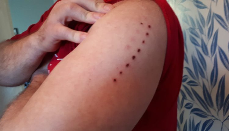 Myself and another girl were the third pair in line to have the kambo so I was able to witness the effects on others first. The others started to look very weary, with their faces red from the kambo before throwing up in the buckets provided. When it was our turn, I went to the alter at the front to get my burns and kambo applied — with it being my first experience, I received four insertions of kambo.