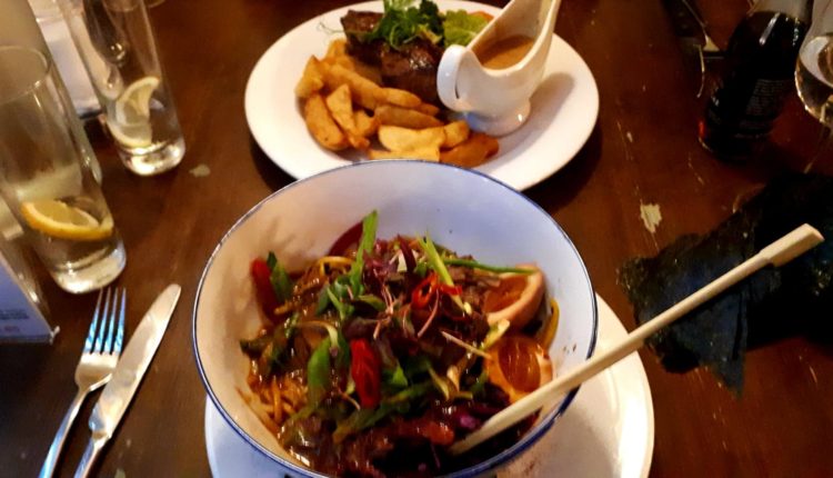 To start I enjoyed a new dish, Devilled Chicken Wings, and my partner chose Potted Prawns. For our mains I selected the new Korean Style Fillet Of Beef (with noodles) and my dining partner enjoyed the (also new) 8oz Prime Rump Steak — slow braised and delightfully tender. As the photos suggest, generous portions as ever and real quality!