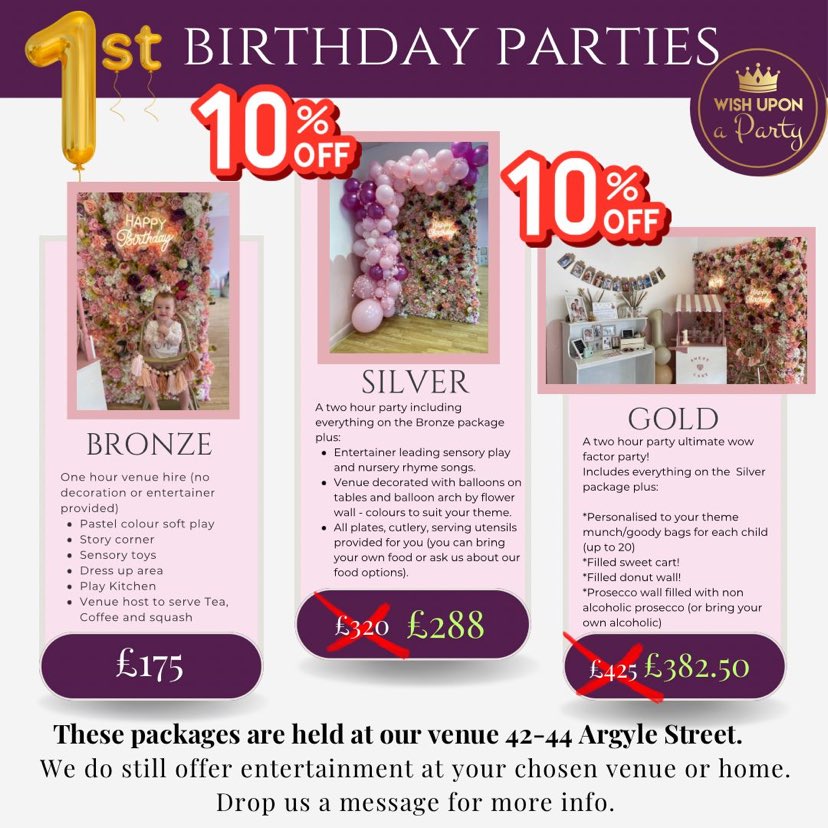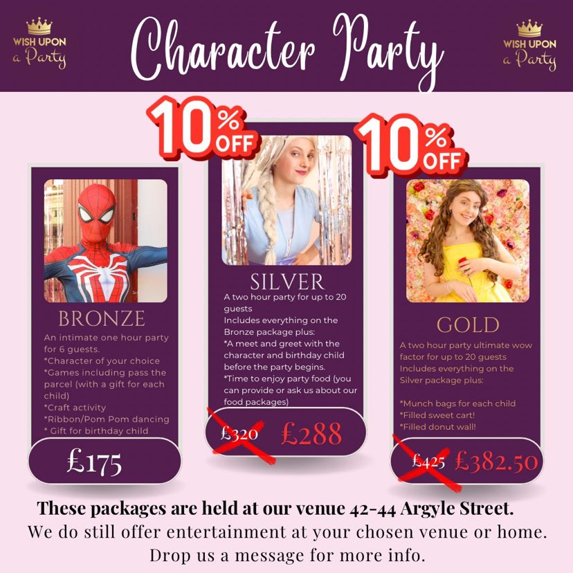 The new 2024 packages are amazing value — with a choice of over 80 different characters, games, activities, dance, a soft play area, a floral wall, a donut wall, a sweet cart, balloon arches, personalised munch boxes, food and drink and more! Suitable for 0 to 12 year olds, the magical parties have had over 500 5 star reviews since the venue opened on Argyle Street in 2022.