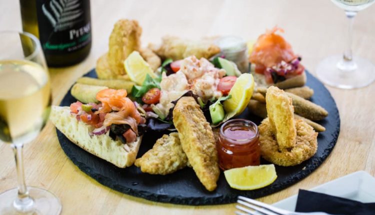 The seafood platter features quality fresh seafood including beer battered cod goujons and tartar sauce, smoked salmon bruschetta, light dusted squid rings and sweet chilli sauce, white bait with a wedge of lemon and prawn cocktail. The carafe of wine features chilled sauvignon blanc but can be exchanged for red if required.