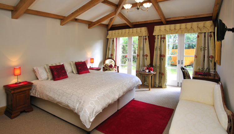 This large, ground floor bedroom in the Coach House is stylishly decorated in deep reds and cream and has a splendid view of the garden with double doors that open onto its own patio area.
