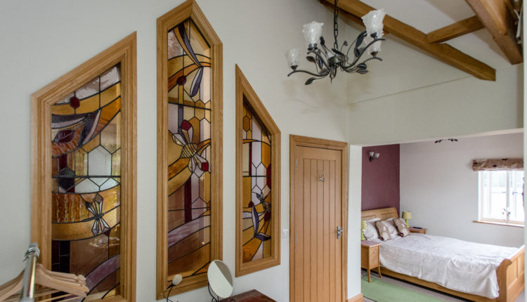 This spacious bedroom on the first floor of the Coach House has a small lounge area, a king size, oak sleigh bed and an impressive stained glass window featuring a Queen Bee and colourful dragon fly which overlooks the chandelier at the top of the stairs.