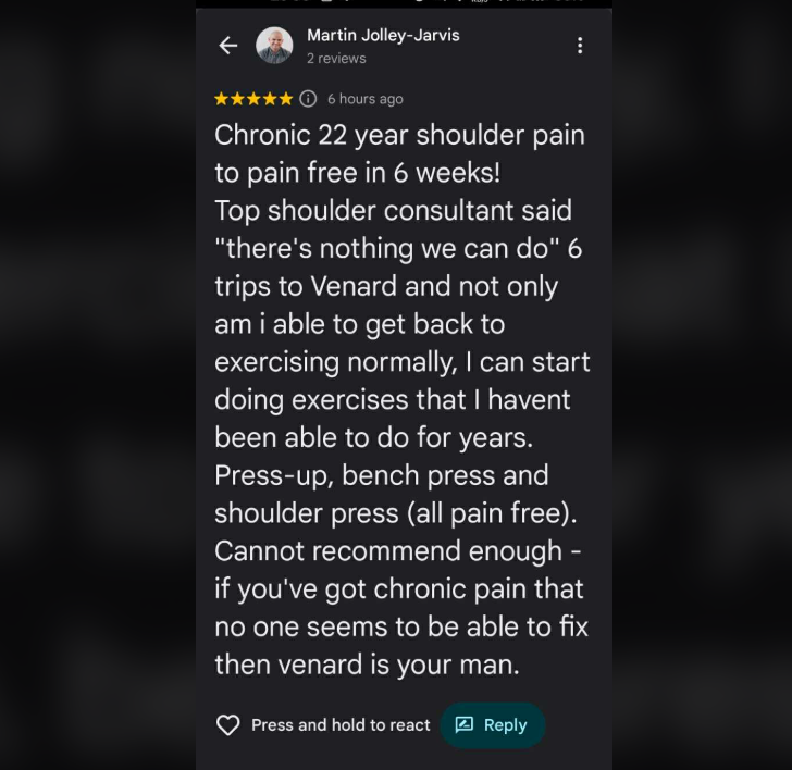 Angela said: “My daughter was on the receiving end of a bad tackle during a football match. She was advised it was soft tissue damage and she would recover in 3-4 weeks but months later she was still in pain. After 3 sessions with Venard she was back playing football and scoring goals. Five sessions now completed and she’s signed off. The results have been incredible.”