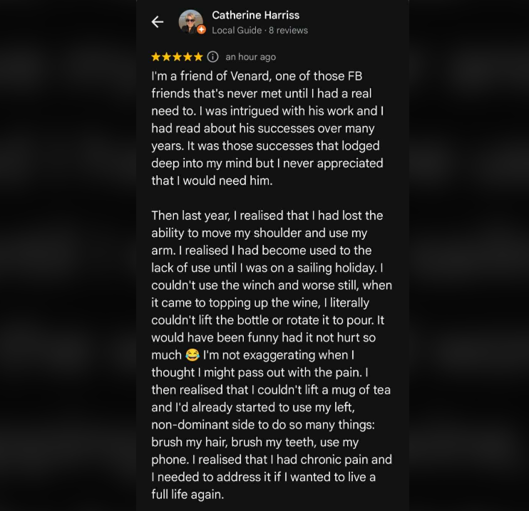 Venard summarised: “The speed of the results come from knowing what to treat. Muscles and joints don’t tighten up and give out pain unless the nervous system tells it to. Working out why the nervous system is sending these signals is key and saves you a lot of time and unnecessary costs long term. Finding the causes and solving them is pretty straightforward. How fast you get your life back and what memories and experiences you get to make is up to you.”