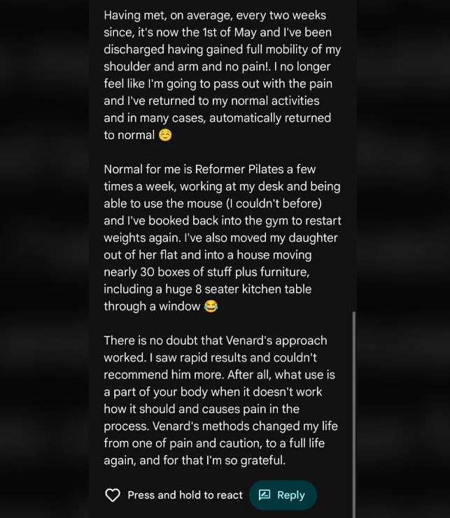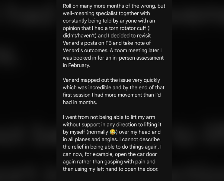 Venard offers an initial 30 minute video call to discuss your issue, establish if you are a good fit for his work and whether he can help you. The next step is booking an in-person assessment session where he maps out what is going on, why the pain is there, likely causes and a projected outcome where you get to see and feel the improvements and changes that are possible.