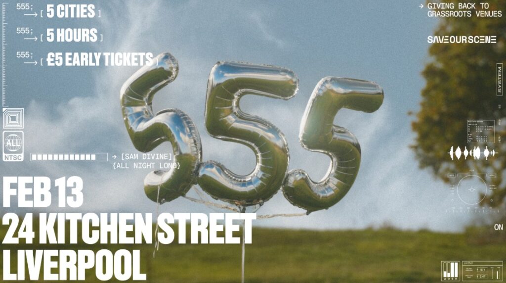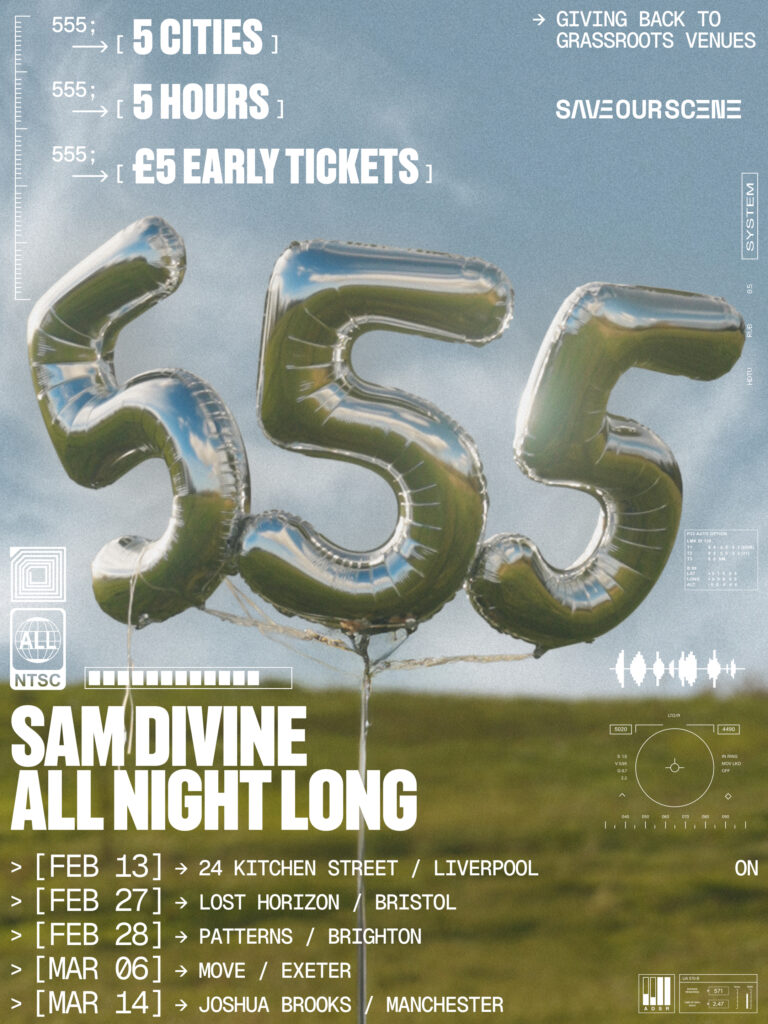More than a tour, 555 is a statement: a reminder of the power of local dancefloors, shared moments, and music experienced fully in the present. By partnering with Save Our Scene, Sam Divine places the spotlight firmly on the future of independent venues and the communities that keep them alive.