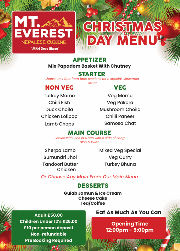 Located on Wallasey Road, Mt Everest became Wirral’s first Nepalese restaurant when it opened in 2023 and has since established itself as a favourite in East Wirral — with countless 5 star reviews. The intimate little gem serves up intriguing Nepalese dishes and has curated an exciting set menu for Christmas Day.