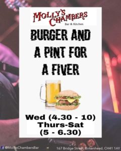 Have you been to Wirral’s No.1 live music venue yet? Molly’s Chambers, situated on Bridge Street just around the corner from Hamilton Square, offers great food, top quality live music and entertainment from Wednesday to Sunday. In this feature we check out their amazing offers and what’s on in the coming weeks….