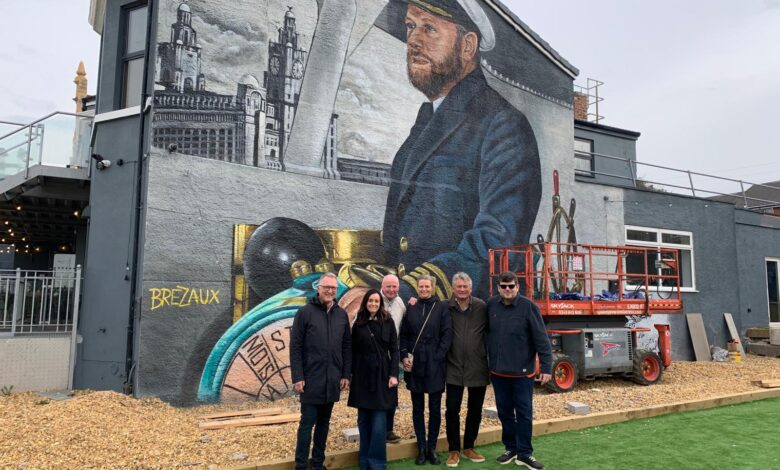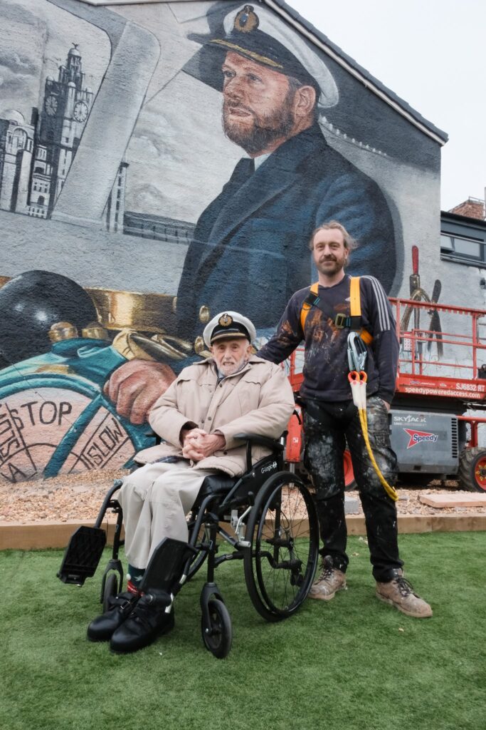 The final design shows Captain Mike in command, with the Liver Building skyline seen through the bridge window. It’s not just a portrait — it’s a story written on brick, a mural that belongs to everyone who’s ever looked out over that river and felt its pull.