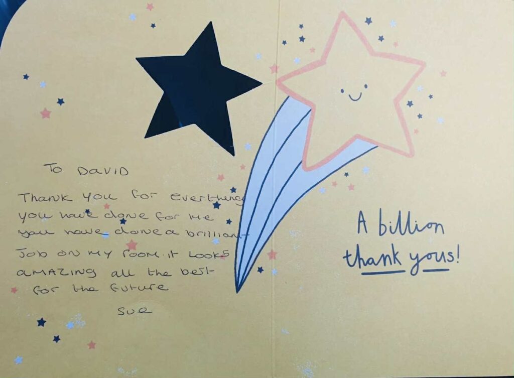 Susan has since shared her gratitude, leading to an outpouring of praise from locals celebrating Dave’s kindness and craftsmanship. As a gesture of her thanks she gave Dave a heartwarming card and it is a reminder that whereby we often here horror stories about ‘cowboy’ builders ripping people off, there are also many good, decent tradespeople who go the extra mile.