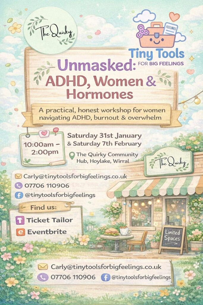 • A practical workshop for women focused on ADHD, hormonal wellbeing, burnout and overwhelm, running on two Saturdays (January 31st & February 7th) at The Quirky Community Hub in Hoylake.