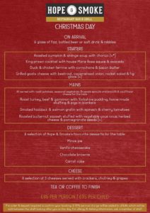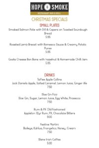 Hope & Smoke will be open from 12pm until 10pm Weds — Sun throughout the festive season, other than Boxing Day (evening only), Dec 27th (closed) and New Years Day (closed). They will be offering their mouth watering regular menu featuring small plates and mains plus some Christmas Special small plates and drinks.